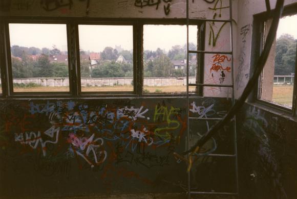 The spray-painted interior of an abandoned watchtower; the former border strip with remnants of the Berlin Wall in the background