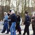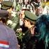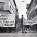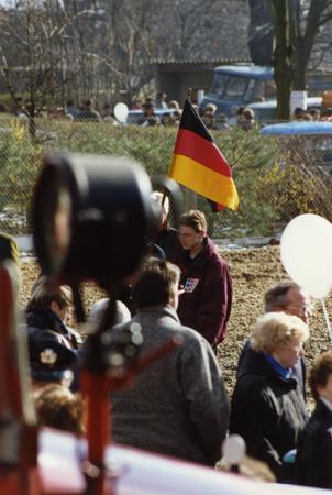 A pedestrian with a German flag at the street party held for the border crossing opening at Oranienburger Chaussee (Glienicke/Nordbahn)/Berliner Straße (Hermsdorf) at the so-called "Entenschnabel" ("duck's bill"), the western end of the Straße Am Sandkrug in the Brandenburg borough of Glienicke/Nordbahn (that reached into the Berlin territory in the shape of a duck's bill).