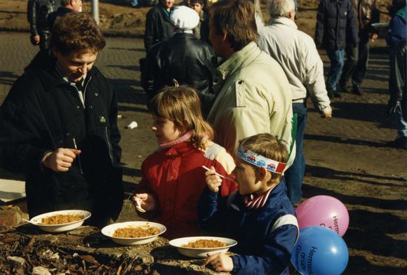 People at the street party held for the border crossing opening at Oranienburger Chaussee (Glienicke/Nordbahn)/Berliner Straße (Hermsdorf) at the so-called "Entenschnabel" ("duck's bill"), the western end of the Straße Am Sandkrug in the Brandenburg borough of Glienicke/Nordbahn (that reached into the Berlin territory in the shape of a duck's bill).
