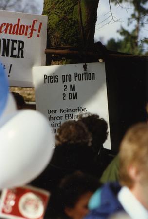 Angebotsschild eines Imbissstands beim Straßenfest anlässlich der Öffnung des Grenzübergangs Oranienburger Chaussee (Glienicke/Nordbahn)/Berliner Straße (Hermsdorf) am so genannten "Entenschnabel", dem westlichen Ende der Straße Am Sandkrug in der brandenburgischen Gemeinde Glienicke/Nordbahn, die schnabelartig in das Berliner Gebiet hineinreicht