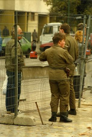 border guard, cigarette, fence, group of people, man, pavement, urban renewal