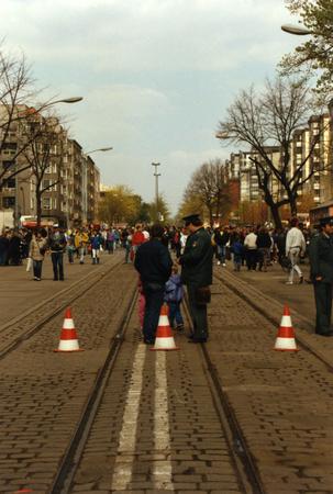 Pedestrians and members of the People's Police on Bernauer Straße, closed off in preparation of the new border crossing installed on 11 November 1989