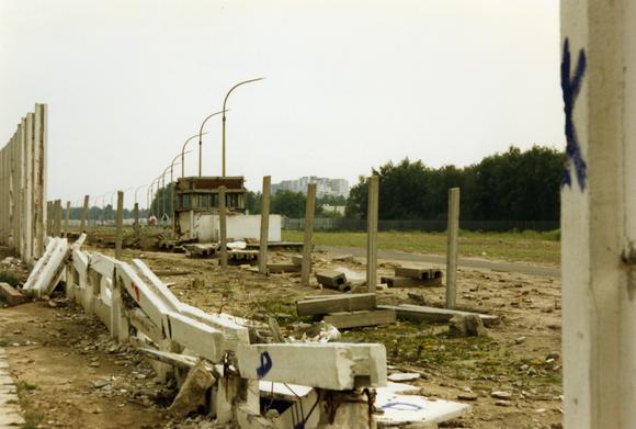 Blick in den ehemaligen Grenzstreifen mit Mauerresten und einem demolierten Wachtturm