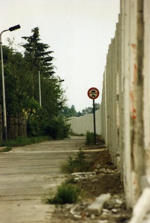 A view of the former border patrol road; remnants of the barbed wire fence and illumination strip on the left