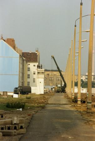 The dismantling of the Berlin Wall in Bernauer Straße; the former border patrol road in the center; illumination strip to the right