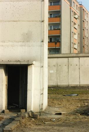 Offener Eingang eines Wachtturms im ehemaligen Grenzstreifen an der Bernauer Straße, im Hintergrund die Ostseite der Berliner Mauer