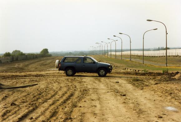 An off-road vehicle inside the former border strip; the Hinterlandmauer (inner Eastern wall) on the left; illumination strip, border patrol road and the East side of the Berlin Wall to the right