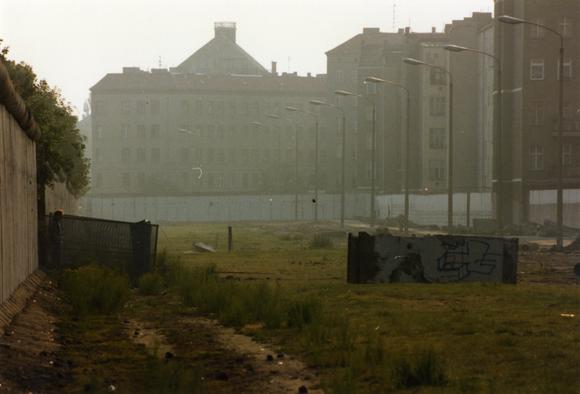 The former border strip alongside Bernauer Straße; individual segments of the Berlin Wall in the foreground; the illumination strip and border patrol road to the right