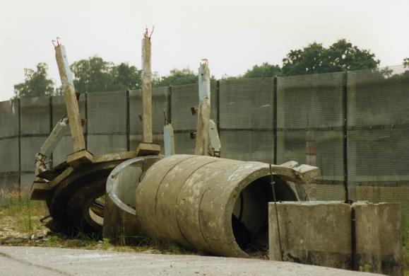 The dismantled concrete parts belonging to a watchtower; the expanded metal fence in the background