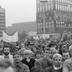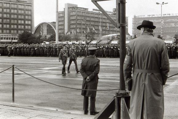 NVA-Soldaten bei der Militärparade am 40. Jahrestag der DDR auf dem Alexanderplatz, im Hintergrund das ehemalige Centrum Warenhaus Berlin
