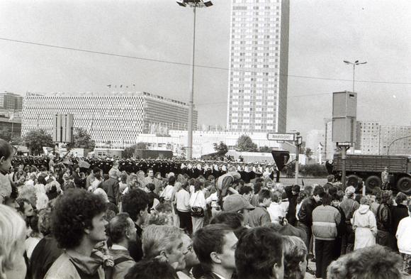 Marines marching at the military parade to celebrate the 40th anniversary of the GDR; the former Centrum Warenhaus department store in the background