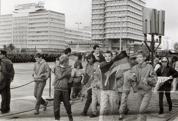 Children with flags at the military parade held on the 40th anniversary of the GDR; the Haus der Elektroindustrie building is in the background that once housed the GDR Ministry of Electrical Engineering and Electronics between 1969 and 1990