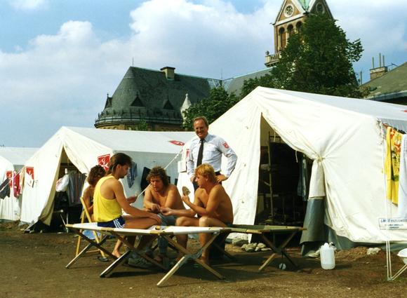 Citizens of the GDR playing cards at the Malteser refugee camp at the Zugliget Church in Budapest; Malteser emergency services began a large-scale operation in Hungary on August 27, 1989: "10,000 refugees from the GDR are being cared for in three camps before they are allowed to travel to the Federal Republic of Germany." (Retrieved and translated from Malteser Hilfsdienst, Erzdiözese München und Freising: Chronik 1955-2005, on April 23, 2009)
