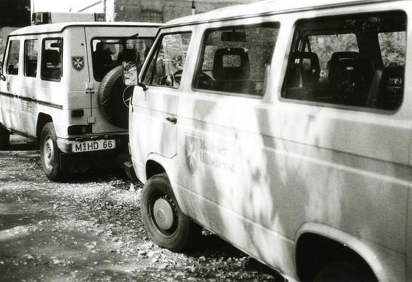 East German Refugees at the Order of Malta Relief Camp, Budapest, 10 September 1989: Malteser emergency services vehicles [26/66]