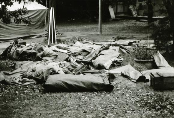 Verpackte Zeltbahnen im Flüchtlingslager an der Zugliget-Kirche in Budapest; am 27. August 1989 beginnt in Ungarn ein Großeinsatz des Malteser Hilfsdienstes: "10 000 Flüchtlinge aus der DDR werden in drei Lagern betreut, ehe sie in die alte Bundesrepublik ausreisen dürfen." (