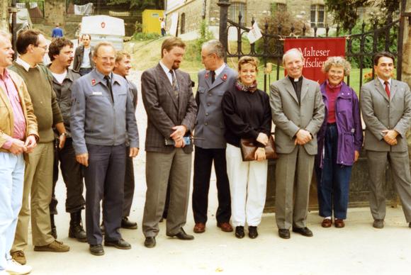 Employees and Hungarian chairman, Pastor Imre Kozma, of Malteser emergency services at the entrance to the refugee camp for GDR citizens at the Zugliget Church in Budapest; Malteser emergency services began a large-scale operation in Hungary on August 27, 1989: "10,000 refugees from the GDR are being cared for in three camps before they are allowed to travel to the Federal Republic of Germany." (Retrieved and translated from