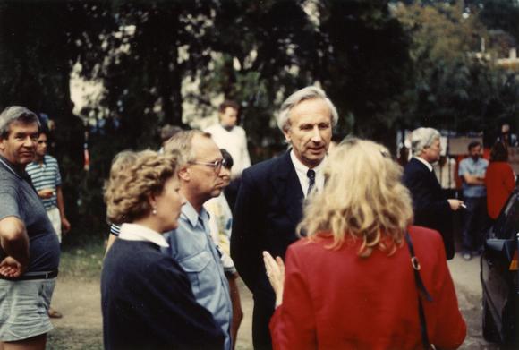 The West German ambassador to Hungary, Alexander Arnot, and Csilla Freifrau von Boeselager, co-founder of the Hungarian Malteser - Caritas emergency services, in the Malteser refugee camp for GDR citizens at Zugliget Church in Budapest; Malteser emergency services began a large-scale operation in Hungary on August 27, 1989: "10,000 refugees from the GDR are being cared for in three camps before they are allowed to travel to the Federal Republic of Germany." (Retrieved and translated from Malteser Hilfsdienst, Erzdiözese München und Freising: Chronik 1955-2005, on April 23, 2009)