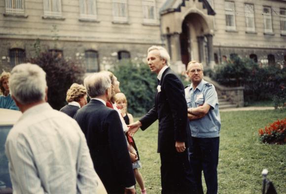 Der Botschafter der BRD in Ungarn, Alexander Arnot, im Flüchtlingslager des Malteser Hilfsdienstes an der Zugliget-Kirche in Budapest, auf deren Gelände ein Flüchtlingslager für DDR-Bürger eingerichtet worden war; am 27. August 1989 beginnt in Ungarn ein Großeinsatz des Malteser Hilfsdienstes: "10 000 Flüchtlinge aus der DDR werden in drei Lagern betreut, ehe sie in die alte Bundesrepublik ausreisen dürfen." (