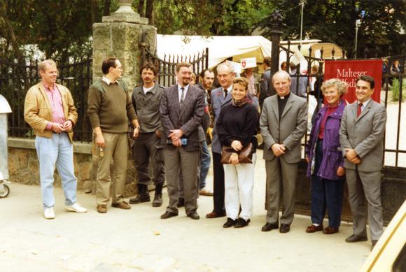 Mitglieder des deutschen Malteser Hilfsdienstes und der Pfarrer Imre Kozma, Vorsitzender des Malteser Hilfsdienstes in Ungarn, vor dem Flüchtlingslager für DDR-Bürger an der Zugliget-Kirche in Budapest; am 27. August 1989 beginnt in Ungarn ein Großeinsatz des Malteser Hilfsdienstes: "10 000 Flüchtlinge aus der DDR werden in drei Lagern betreut, ehe sie in die alte Bundesrepublik ausreisen dürfen." (