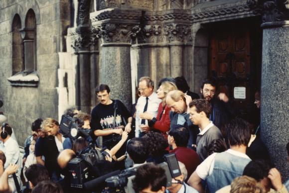 DDR-Flüchtlinge im Malteser-Lager, Budapest, 10. September 1989: Pressekonferenz im Flüchtlingslager an der Zugliget-Kirche [39/66]
