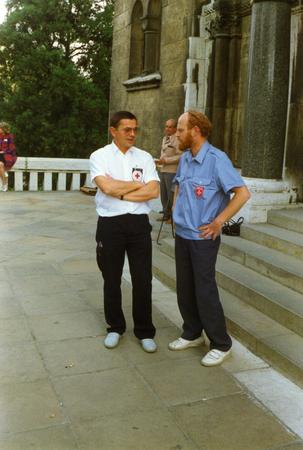 Zwei Mitarbeiter des Roten Kreuzes und des Malteser Hilfsdienstes im Gespräch vor der Zugliget-Kirche, auf deren Gelände vom Malteser Hilfsdienst ein Flüchtlingslager für DDR-Bürger eingerichtet worden war; am 27. August 1989 begann in Ungarn ein Großeinsatz des Malteser Hilfsdienstes: "10 000 Flüchtlinge aus der DDR werden in drei Lagern betreut, ehe sie in die alte Bundesrepublik ausreisen dürfen." (Malteser Hilfsdienst, Erzdiözese München und Freising: Chronik 1955-2005, Stand 23. April 2009)