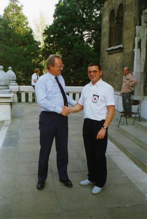 Zwei Mitarbeiter des Roten Kreuzes und des Malteser Hilfsdienstes beim Handschlag vor der Zugliget-Kirche, auf deren Gelände vom Malteser Hilfsdienst ein Flüchtlingslager für DDR-Bürger eingerichtet worden war; am 27. August 1989 begann in Ungarn ein Großeinsatz des Malteser Hilfsdienstes: "10 000 Flüchtlinge aus der DDR werden in drei Lagern betreut, ehe sie in die alte Bundesrepublik ausreisen dürfen." (Malteser Hilfsdienst, Erzdiözese München und Freising: Chronik 1955-2005, Stand 23. April 2009)