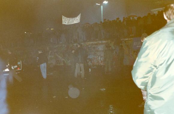 Menschen auf und vor der Mauer am Grenzübergang Brandenburger Tor, der am 22. Dezember 1989 feierlich eröffnet wurde. Zur Grenzöffnung durch den damaligen Bundeskanzler Helmut Kohl und den Vorsitzenden des DDR-Ministerrates Hans Modrow erschienen hunderte Kamerateams und mehr als 100.000 Menschen.