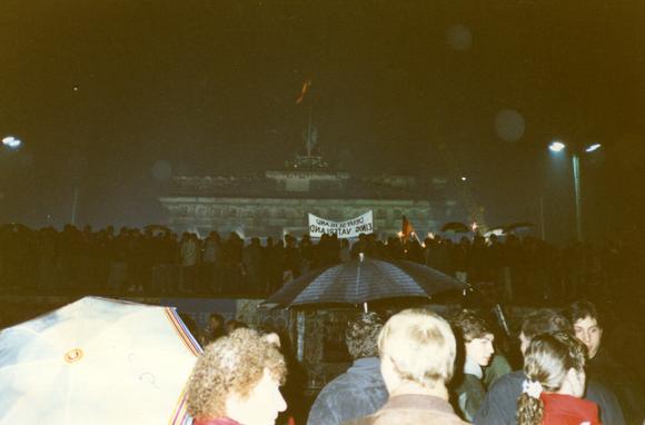 People by and on the Wall at Brandenburg Gate, where a new border crossing was opened amidst celebrations on December 22, 1989. The opening ceremony was carried out by Helmut Kohl and the East German premier, Hans Modrow, and attracted more than 100,000 onlookers and hundreds of camera teams