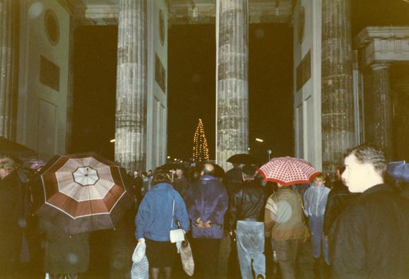 A crowd of people on Pariser Platz close to Brandenburg Gate, where a new border crossing was opened amidst celebrations on December 22, 1989. The opening ceremony was carried out by Helmut Kohl and the East German premier, Hans Modrow, and attracted more than 100,000 onlookers and hundreds of camera teams