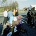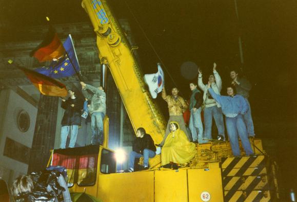 People with European, German and South Korean flags on a crane at Brandenburg Gate, where a new border crossing was opened amidst celebrations on December 22, 1989. The opening ceremony was carried out by Helmut Kohl and the East German premier, Hans Modrow, and attracted more than 100,000 onlookers and hundreds of camera teams