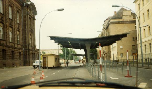 A view from a car of the Invalidenstraße border crossing, one of seven street crossings between East and West Berlin (between Soviet and British sectors) while the Wall was up