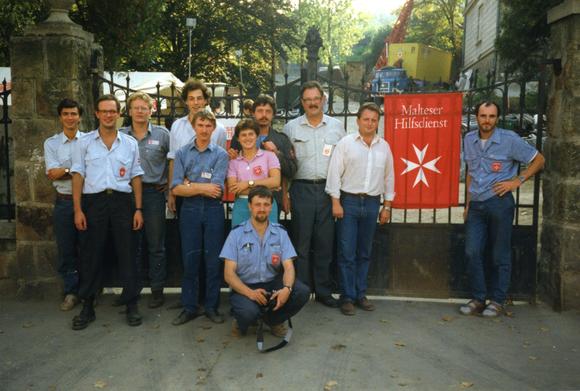Mitarbeiter des Malteser Hilfsdienstes vor dem Malteser-Lager an der Zugliget-Kirche in Budapest, auf deren Gelände ein Flüchtlingslager für DDR-Bürger eingerichtet worden war; am 27. August 1989 beginnt ein Großeinsatz des Malteser Hilfsdienstes in Ungarn: "10 000 Flüchtlinge aus der DDR werden in drei Lagern betreut, ehe sie in die alte Bundesrepublik ausreisen dürfen." (Malteser Hilfsdienst, Erzdiözese München und Freising: Chronik 1955-2005, Stand 23. April 2009)