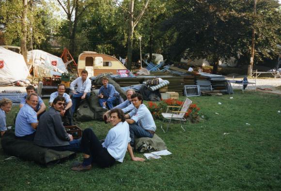Mitarbeiter des Malteser Hilfsdienstes im Flüchtlingslager an der Zugliget-Kirche in Budapest; am 27. August 1989 beginnt ein Großeinsatz des Malteser Hilfsdienstes in Ungarn: "10 000 Flüchtlinge aus der DDR werden in drei Lagern betreut, ehe sie in die alte Bundesrepublik ausreisen dürfen." (Malteser Hilfsdienst, Erzdiözese München und Freising: Chronik 1955-2005, Stand 23. April 2009)