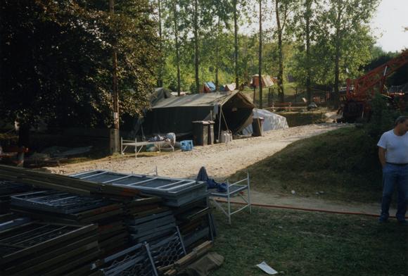 Feldbetten und Zelte im Flüchtlingslager an der Zugliget-Kirche in Budapest; am 27. August 1989 beginnt ein Großeinsatz des Malteser Hilfsdienstes in Ungarn: "10 000 Flüchtlinge aus der DDR werden in drei Lagern betreut, ehe sie in die alte Bundesrepublik ausreisen dürfen." (Malteser Hilfsdienst, Erzdiözese München und Freising: Chronik 1955-2005, Stand 23. April 2009)
