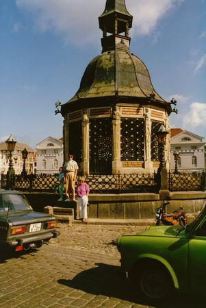 In front of the Wasserkunst fountain in Wismar