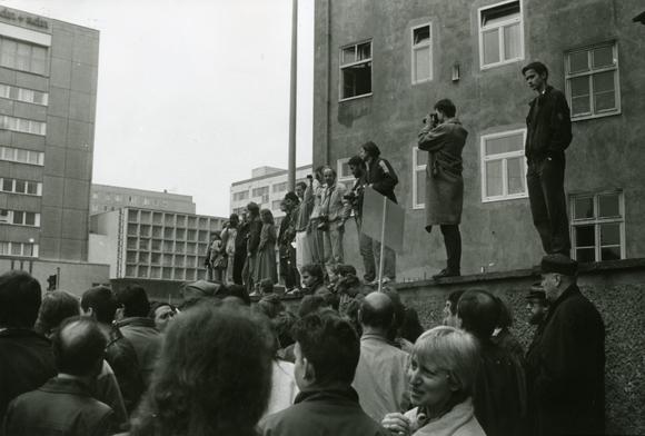 Protesters in front of the ADN [German General News Service] building during the Alexanderplatz Demonstration, the "largest, non state-run protest(s) in the history of the GDR" (retrieved and translated from Wikipedia: Alexanderplatz-Demonstration, on April 23, 2009).