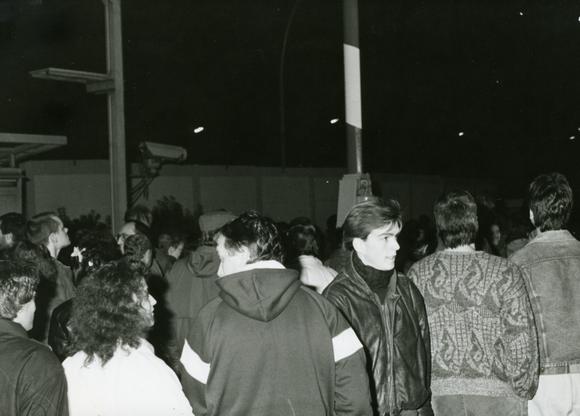 Schaulustige auf der Bösebrücke bei der Öffnung des Grenzübergangs Bornholmer Straße, während der Zeit der Mauer einer der sieben Straßenübergänge zwischen Ost- und West-Berlin (zwischen sowjetischem und französischem Sektor). Der Grenzübergang Bornholmer Straße war in der Nacht vom 9. zum 10. November 1989 der erste, an dem die Passkontrollen zeitweise eingestellt wurden.