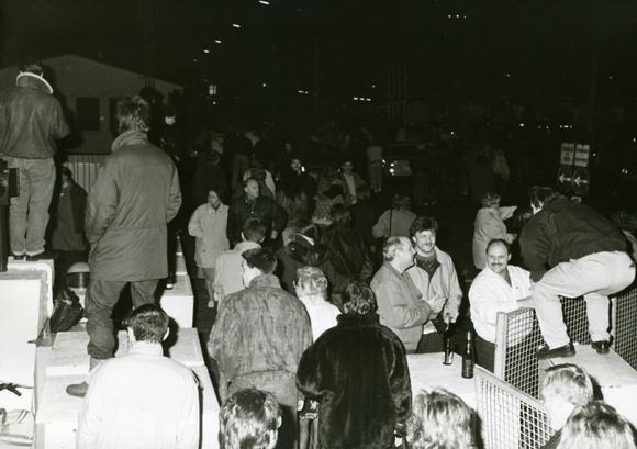 Passanten und Feiernde auf der Bösebrücke bei der Öffnung des Grenzübergangs Bornholmer Straße, während der Zeit der Mauer einer der sieben Straßenübergänge zwischen Ost- und West-Berlin (zwischen sowjetischem und französischem Sektor). Der Grenzübergang Bornholmer Straße war in der Nacht vom 9. zum 10. November 1989 der erste, an dem die Passkontrollen zeitweise eingestellt wurden.