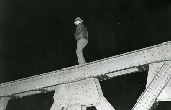 Mann auf dem Brückenbogen der Bösebrücke bei der Öffnung des Grenzübergangs Bornholmer Straße, während der Zeit der Mauer einer der sieben Straßenübergänge zwischen Ost- und West-Berlin (zwischen sowjetischem und französischem Sektor). Der Grenzübergang Bornholmer Straße war in der Nacht vom 9. zum 10. November 1989 der erste, an dem die Passkontrollen zeitweise eingestellt wurden.