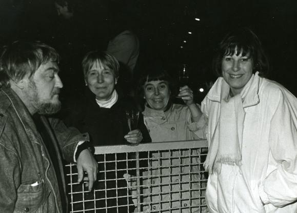 Menschen mit Sektgläsern auf der Bösebrücke bei der Öffnung des Grenzübergangs Bornholmer Straße, während der Zeit der Mauer einer der sieben Straßenübergänge zwischen Ost- und West-Berlin (zwischen sowjetischem und französischem Sektor). Der Grenzübergang Bornholmer Straße war in der Nacht vom 9. zum 10. November 1989 der erste, an dem die Passkontrollen zeitweise eingestellt wurden.