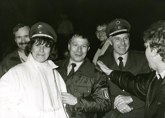 Merry police and an onlooker during the opening of the border crossing at Bornholmer Strasse, one of seven street crossings between East and West Berlin (between the Soviet and French sectors) while the Wall was up and the first at which passport control was partially suspended on the night of 9th November 1989.