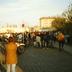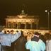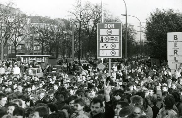 Crowds of people at the open border crossing at Bornholmer Strasse, one of seven street crossings between East and West Berlin (between the Soviet and French sectors) while the Wall was up and the first at which passport control was partially suspended on the night of 9th November 1989.