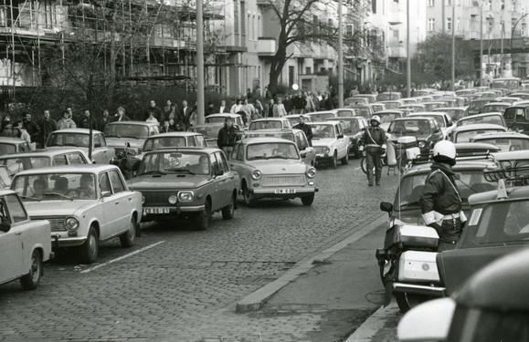 Stau vor dem geöffneten Grenzübergang Bornholmer Straße, während der Zeit der Mauer einer der sieben Straßenübergänge zwischen Ost- und West-Berlin (zwischen sowjetischem und französischem Sektor). Der Grenzübergang Bornholmer Straße war in der Nacht vom 9. zum 10. November 1989 der erste, an dem die Passkontrollen zeitweise eingestellt wurden.