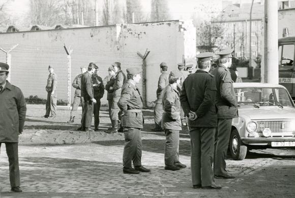 Grenzsoldaten und Polizisten im ehemaligen Grenzstreifen an der Bernauer Straße, wo am 11. November 1989 ein neuer Grenzübergang eingerichtet wurde