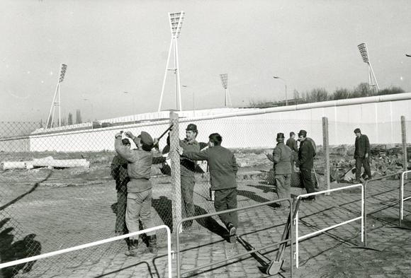 Border guards dismantle a fence at the Eberswalder Strasse/Bernauer Strasse border crossing, installed on 11 November 1989.