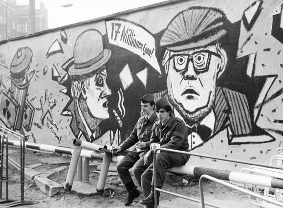 Zwei Grenzsoldaten an der Berliner Mauer vor dem karikaturistischen Mauerbild der Olsenbande (