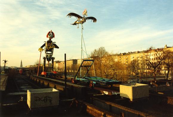 Large, carnivalesque figures on the rail tracks at the Kreuzberg/Treptow border
