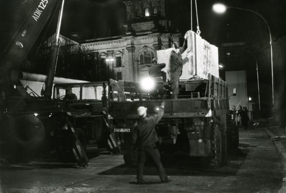 Ein abgebautes Mauersegment wird auf einen Lastkraftwagen verladen, im Hintergrund der Reichstag