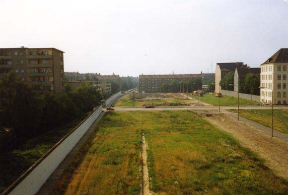 View from a watchtower onto an accessible section of the border strip towards Wildenbruchstraße; the Berlin Wall to the left, the border patrol road and the inner Eastern wall to the right