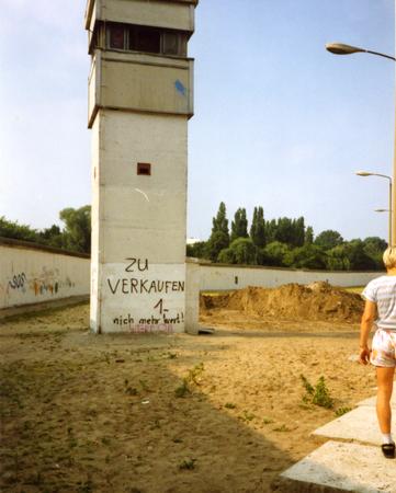 Besprühter Wachtturm vor der Berliner Mauer (Ost)